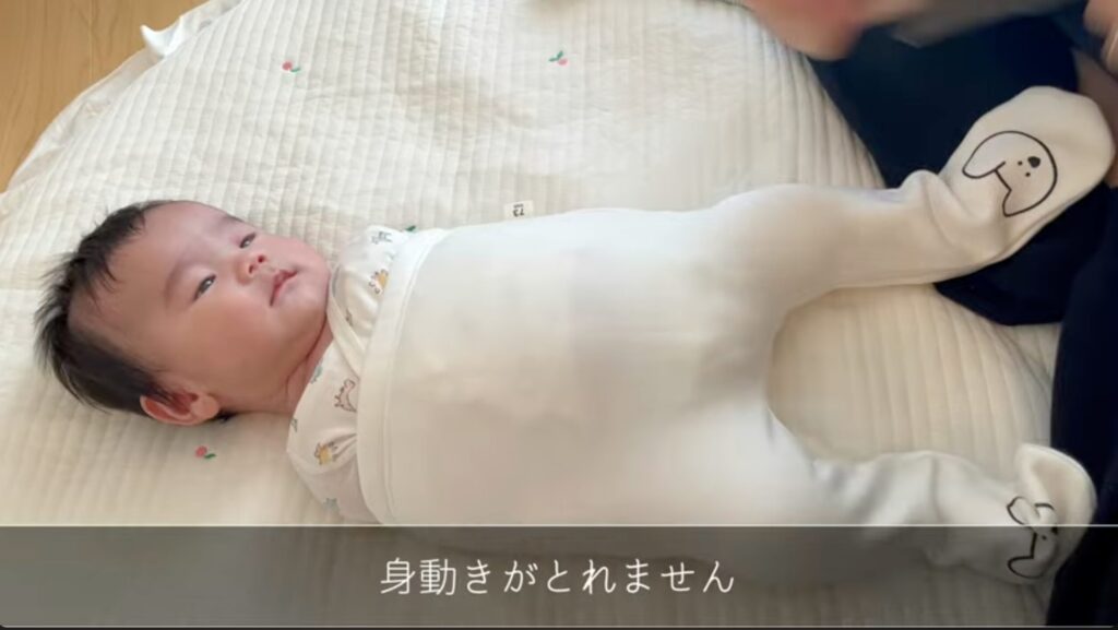 おむつを交換した後、初めてのズボンを履かせてみます。足がとても長く見えるほど、サイズが大きかったようです。
